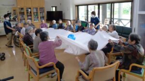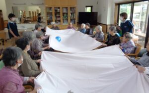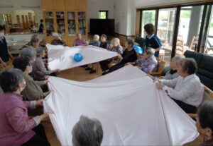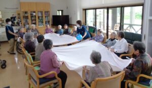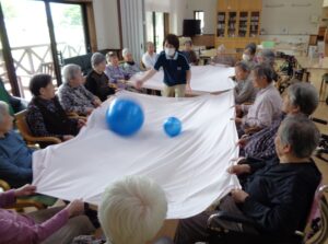 利用者の皆さんは楕円形に並んで頂き、シーツを2枚と大小ボール準備 皆さんでシーツの端々をつかんでぴーんとシーツを貼ったところへボール投入