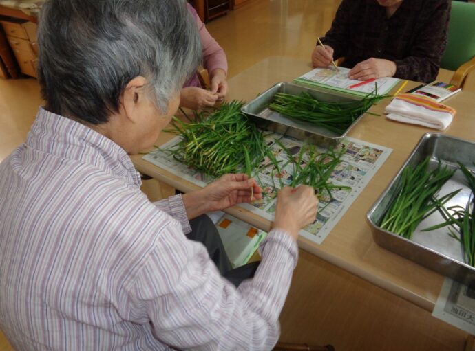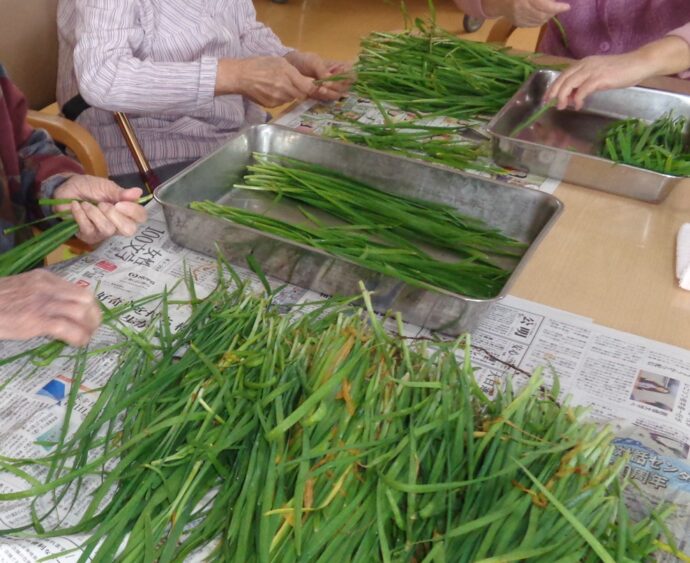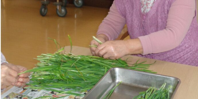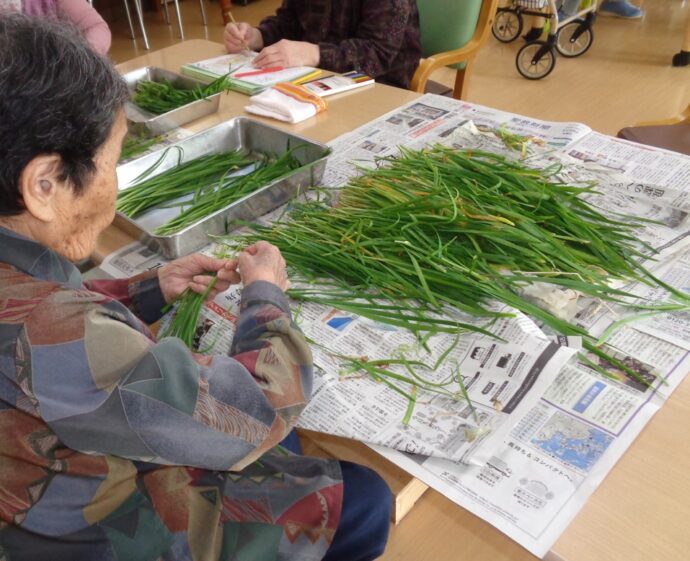 最高齢100歳の利用者さんを中心に皆でねぎ揃えです。 「昔ようやりよったけん…私も出来るばい…」 みんな積極的に参加してくれるのでねぎ揃えもアッと言う間に終わりました。 「またお願いします…」