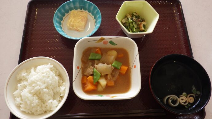 肉じゃがは、のんびり村料理教室で作られた味噌を使って作った味噌肉じゃがです。きゅうりの梅和えの梅も、のんびり村で手作りをされたものを使いました。