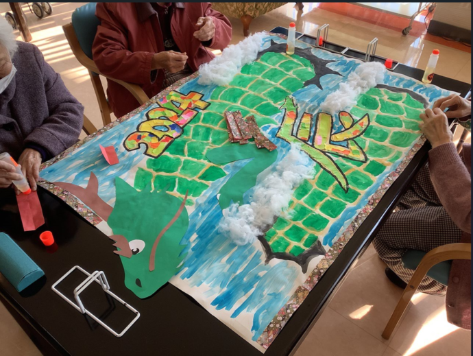 絵具で色を付けたり、綿をつけたり、千代紙で縁取りを作っています。凝った辰の壁画ができています。