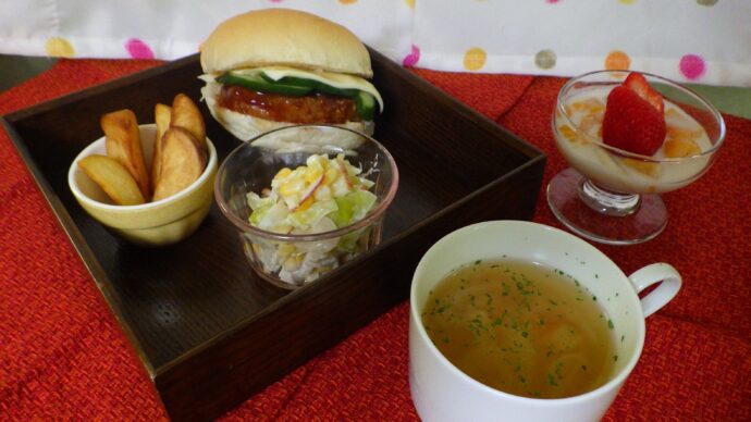 利用者の方のリクエストで『ハンバーガーが食べたい!』との声をいただいたので、一緒に作りました。