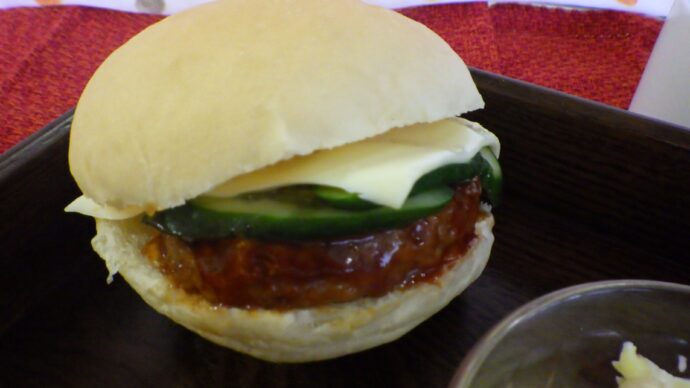 バンズにからしマヨネーズを塗って、てりやき風に味付けしたパテ、きゅうり、スライスチーズをのせてはさみ”てりやきチーズバーガー”の出来上がり。