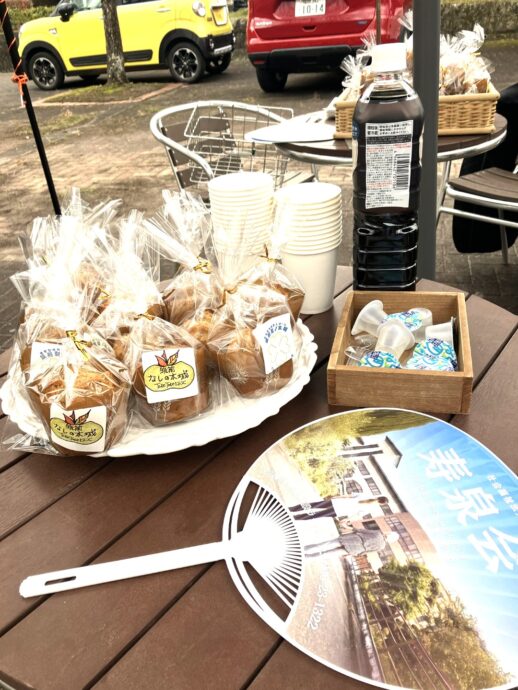 今回は軽トラ市が同時開催されるとのことで、私たち寿泉会もいつもの緑のパラソルを広げて参加させていただきましたよ!