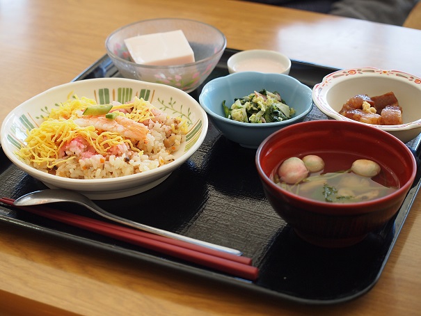 そして、3月3日。ひな祭り当日は、入居者様に、ひな祭りにちなんだ季節のお膳をお召し上がりいただきました。