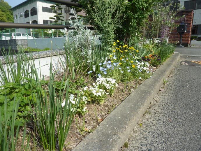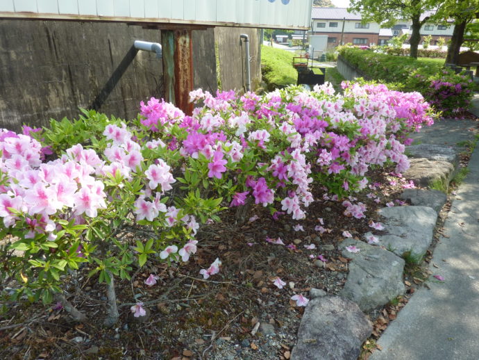 グラウンドゴルフ場の駐車場にはつつじなど、たくさんの花が咲き乱れています。