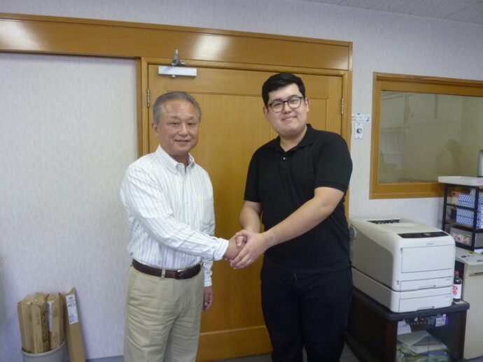 ▲左から当法人統括本部長・稲葉、熊本大学大学院留学生さん