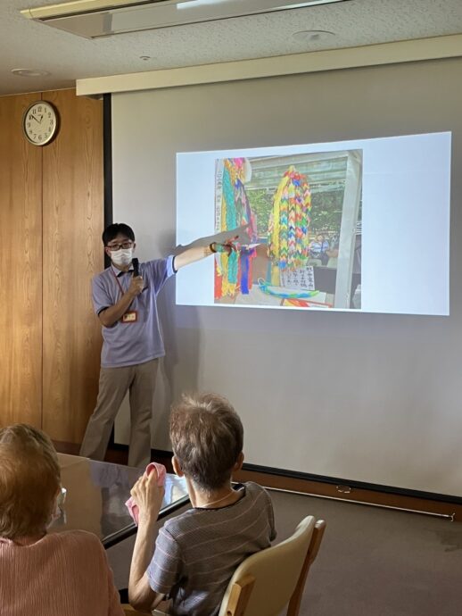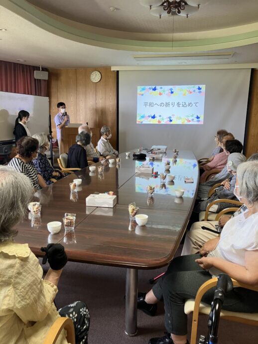 皆さん、自分の折った鶴が広島平和記念公園に奉納されたことを確認し、喜んでいらっしゃいましたよ。そのあと、クイズ大会で脳トレと続き、最後はお菓子とコーヒーで談笑タイムを満喫していただきました。