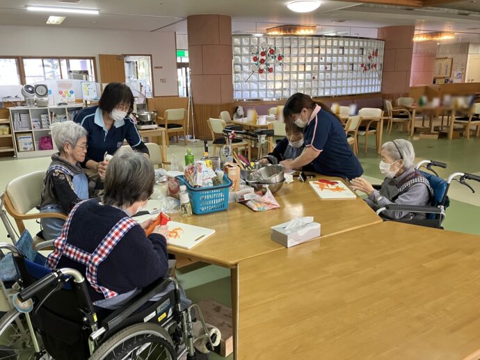 サテライトとは、利用者様に普段とは違うこと、たとえばお料理などを楽しんでいただく活動です。今回は4名の利用者様ががめ煮づくりに挑戦。