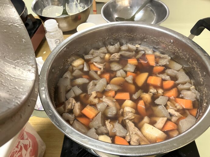 たくさんの具材の皮をむき、包丁で切って煮込みました。