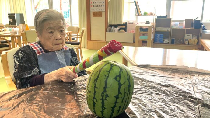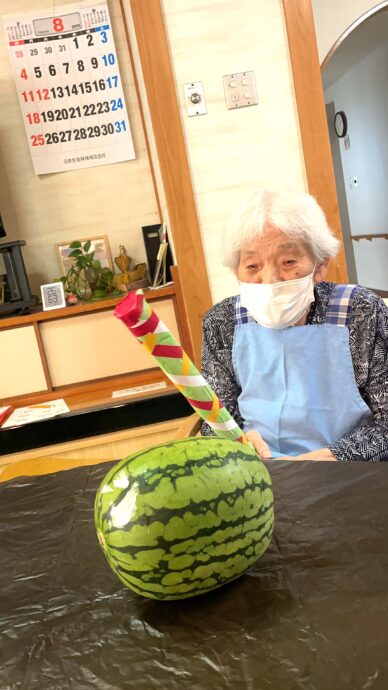 8月18日、ラ・パス入所部では、普段の入所フロアを離れて利用者様に楽しんでいただくサテライト活動として、スイカ割りを実施しました。今回参加者は4名。ラ・パスデイケアのホールを活用して、夏を満喫していただきました。