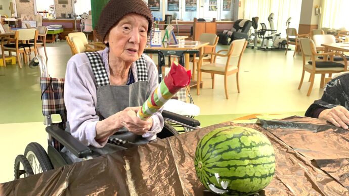 けれども、割ろうとする行為自体を、利用者さんは楽しんでいらっしゃいました!力いっぱいスイカを叩いていましたよ!