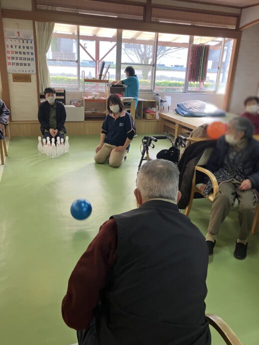 こんにちは!今日はデイケアでボウリング大会が開かれましたよ! 少しだけ水を入れたペットボトルでつくったピンをめがけて、ボールを投げました。 練習2回、本番2回投球して、本番で倒れたピンの数を競いました。 右にいってしまう、左にいってしまうなどなど、意外と難しい様子。 利用者の皆様、本当に真剣に勝負していらっしゃいましたよ!