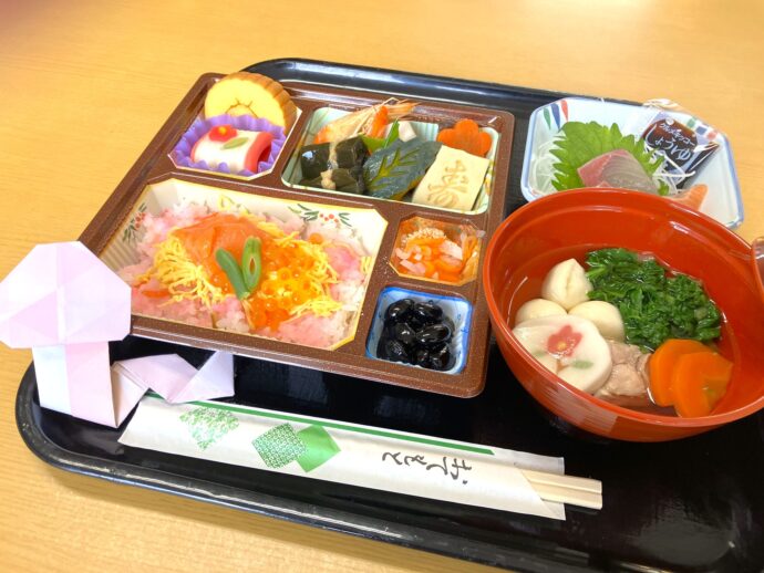 そしてお昼ごはん。お刺身つきのお正月スペシャルでした!