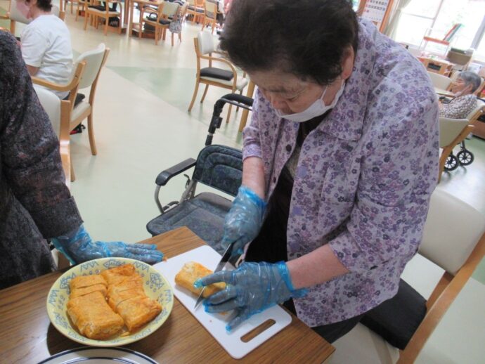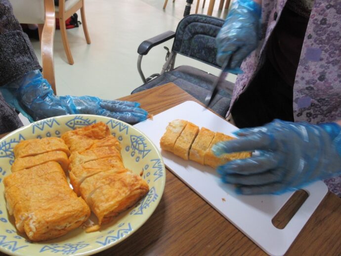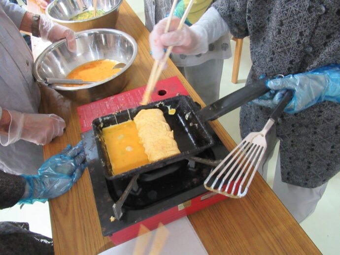 ラ・パスデイケア でお料理イベントを実施!利用者様に卵焼きをつくっていただきました。お料理は大ベテラン主婦の皆様の腕の見せどころ。どうですか?おいしそうでしょう?