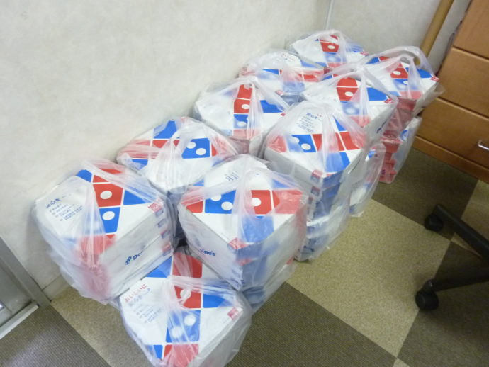 こんにちは!ラ・パスにてドミノ・ピザ筑紫野筑紫店様のご協力により19日と20日、職員全員を対象にピザの配布を行いました。
