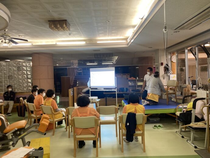 今回はラ・パスリハビリ部の副主任・竹下が講師となり、「脳梗塞やリウマチなどの方の介助」を講義。職員に利用者様役をやってもらい、実際に体・筋肉の動き、無理のかからない動作、体重のかけ方などを学びました。