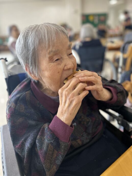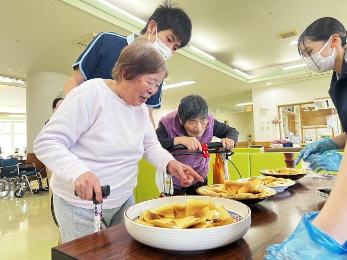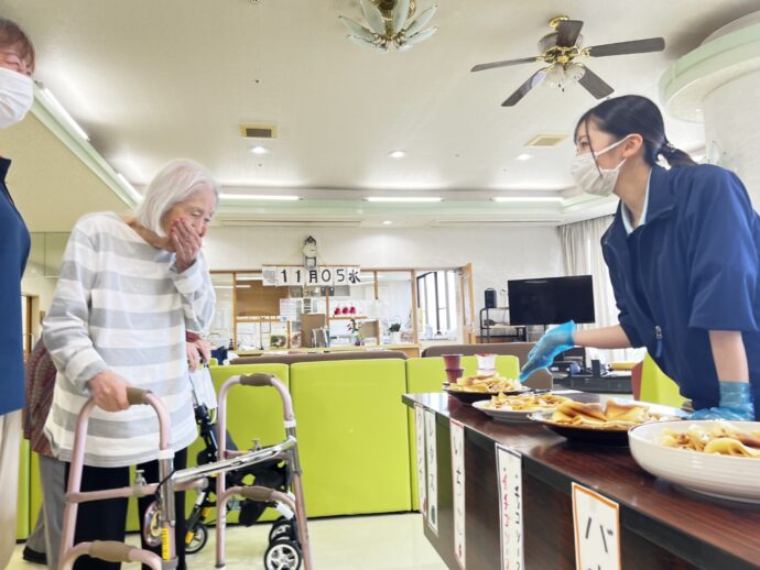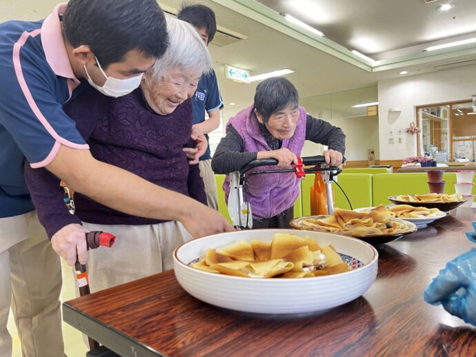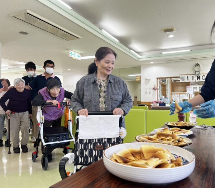 介護老人保健施設ラパス入所部の今月のおやつ会は職員手作りのクレープでした!焼きたてのクレープにいろんな具材を入れて、利用者様に選んでお召し上がりいただきました。このうれしそうな顔!