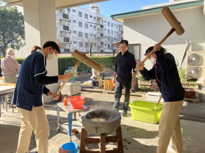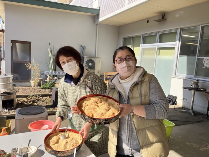 もちは、あんこ、きなこ、大根おろしで職員にふるまいました。
