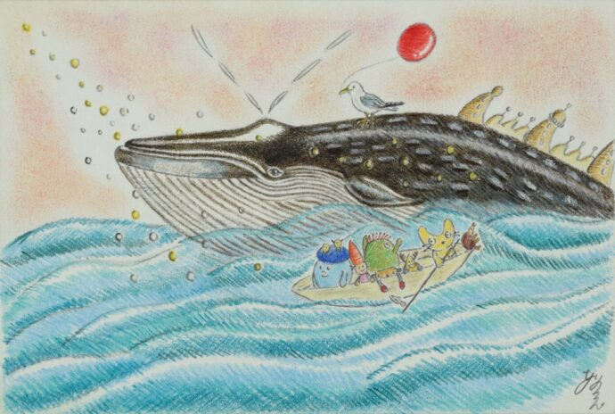 「前に進むということは、勇気のいることだけれど、一歩踏み出すことで、何かが変わるかもしれない。自分の特性を大切なアイテムとして、誰かに伝えることで今よりもっと素敵な旅の舵がきれるはず。そう思い始めたときに描いた一枚。作家本人が描き続けているキャラクター達が大きな海へ、明日へ向けて、出発している姿は本人の心をそのまま表現している。」
