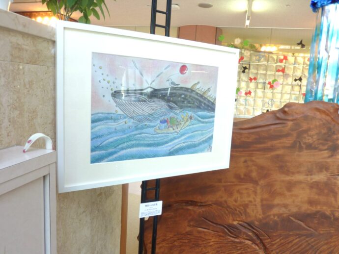 ラ・パスでは今年4月から、玄関に絵画を設置しています。3ケ月ごとに掲示する絵を変えており、8月からは「明日への出発」と題されたくじらの絵を飾っています。