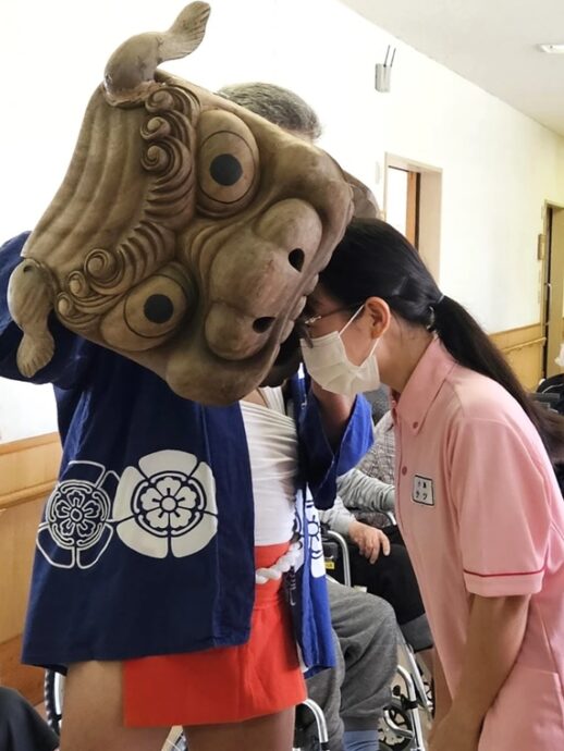 地域の行事「お獅子入れ」で、職場にもお獅子が来てくれました。頭を噛んでもらうと病気にかからなくなると聞いて、私も噛んでもらいました。お獅子は、ちょっとかわいいと思いました。