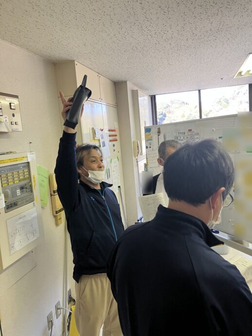 各フロアの責任者は被害状況を確認し、自主消防隊長に報告します。今回は幸いにも被害なしでした。
