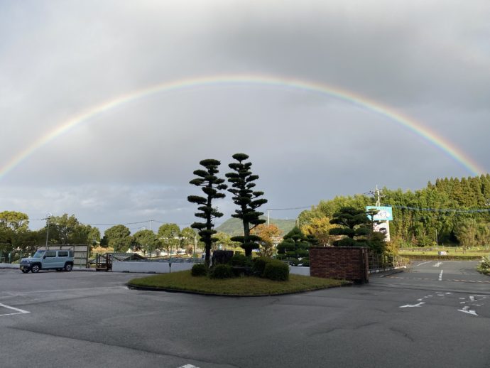 こんにちは! 今朝、冷たい雨が降り続いたあと、北の空を見ると大きくアーチを描いた虹が! とても美しかったので、皆様におすそわけです!