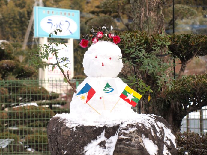 ラ・パスで働いている2か国の職員の国旗(左フィリピン、右ミャンマー)と真ん中に朝倉市の市章を掲げたカワイイ雪だるまです⛄