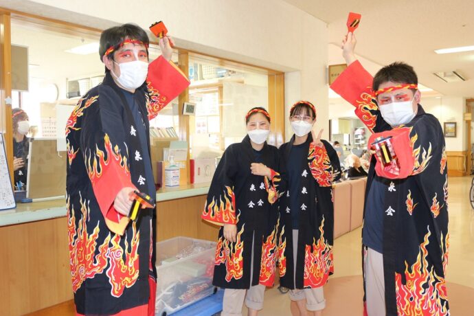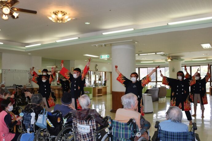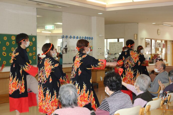 2月12日、入所部介護職員で入所者様に「黒田節」の踊りを披露しました。