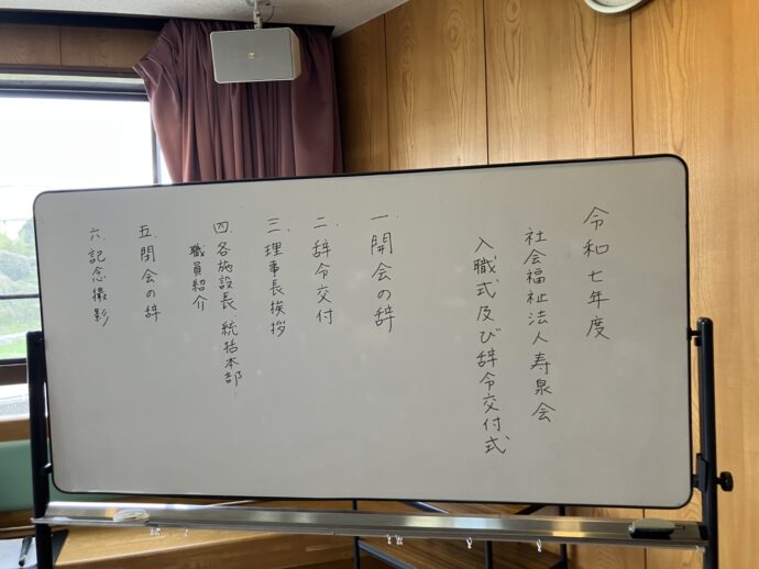 辞令交付式では、寿泉会全体の新しい入職職員、異動や昇進・昇格の対象職員に辞令が交付されます。