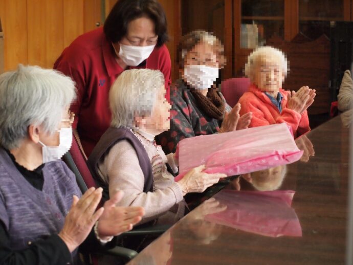 毎月、ラ・パスでは入所者様の誕生会を実施しています。 1月26日はコロナ感染症が落ち着いてきたのもあり、2階と3階フロア合同で誕生会を行いました。 1月生まれの入所者様は13名。