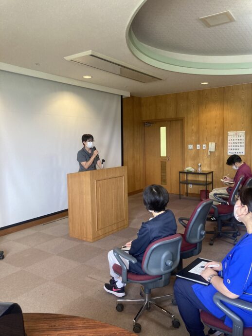 今月は施設長の訓示のあと、新しく加わった職員の紹介とあいさつが行われ、その後、研修が実施されました。