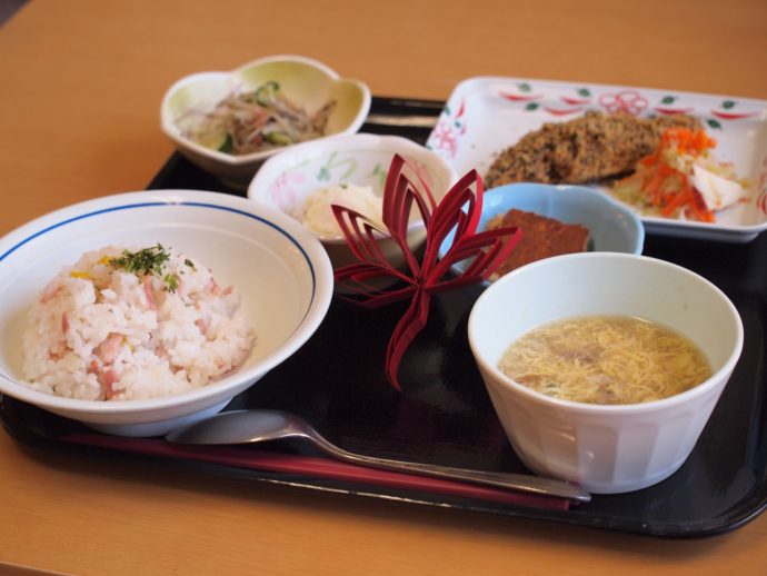 鮭の香草焼きをはじめ、新ごぼうやカボチャなど秋の食材をふんだんに使った献立をお召し上がりいただきました。