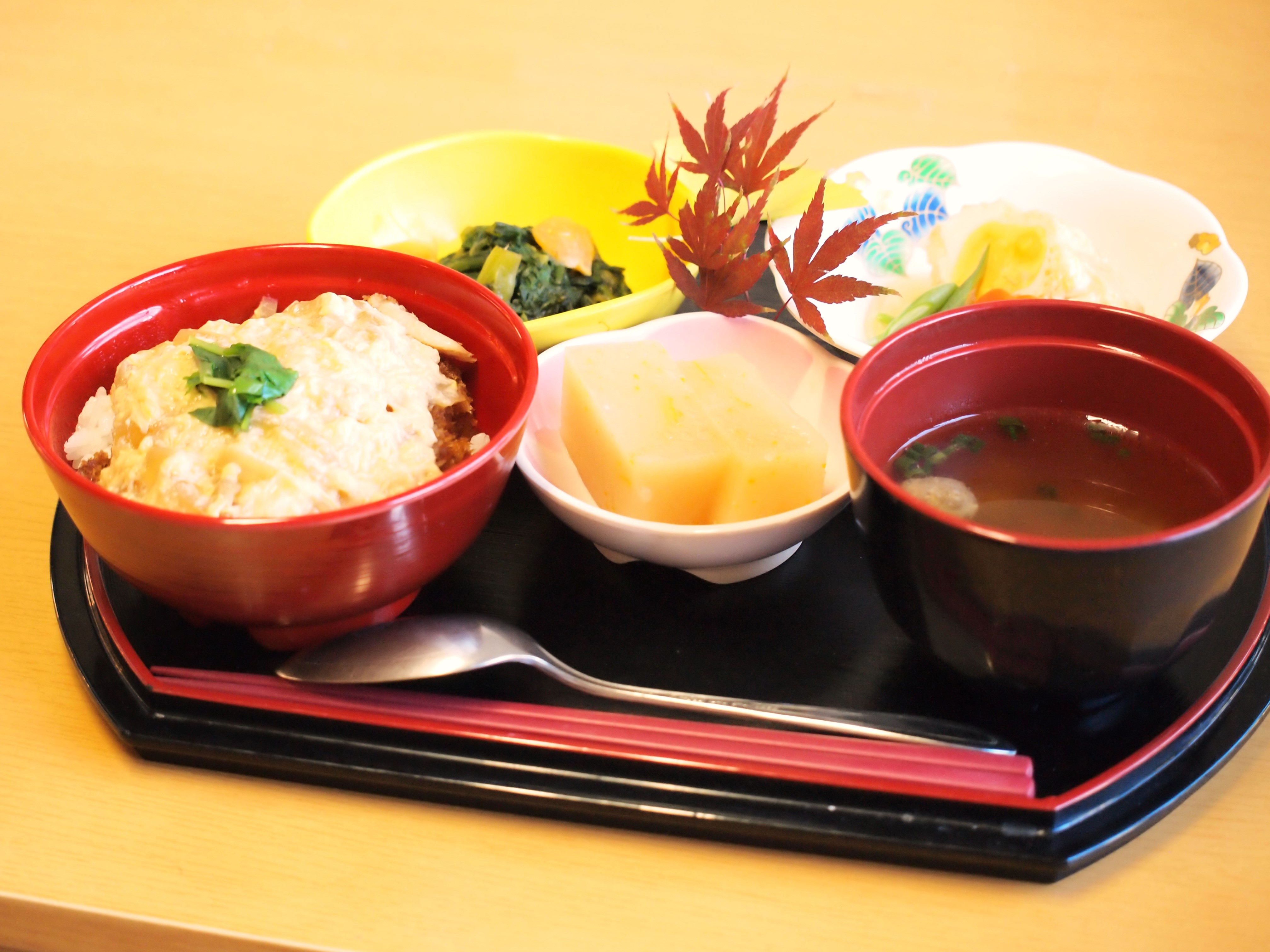春菊とみかんのサラダ けんちん汁 ゆずようかん チキンカツ丼