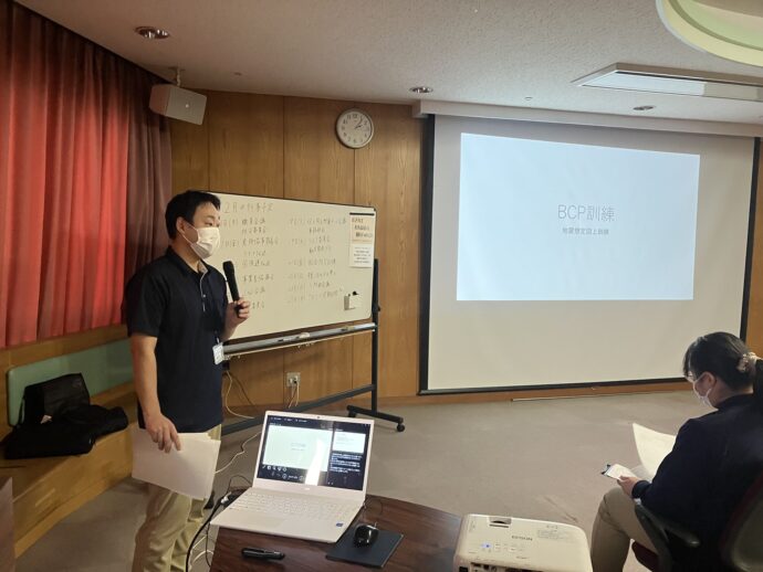 そのあとはBCP訓練です。BCPというのは万一の災害にあっても、事業を継続することができるようにする計画のこと。今回は大地震が起こったときに自分はどういう動きをすればいいのか、考える訓練を行いました。