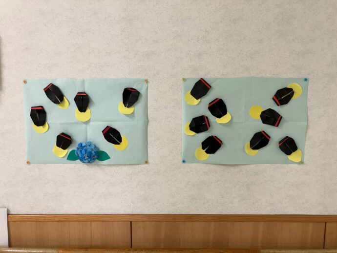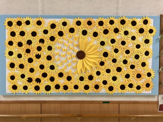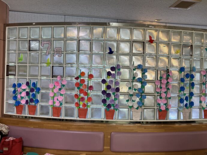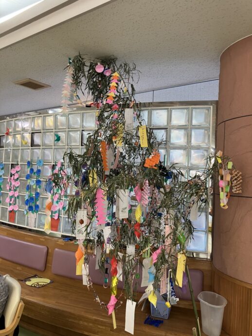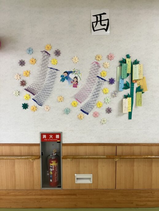 #介護老人保健施設ラパス の7月の壁画です!7月は七夕と夏がテーマ。デイと入所のそれぞれの利用者様が職員とともに大きな作品をつくりました。