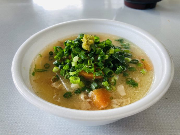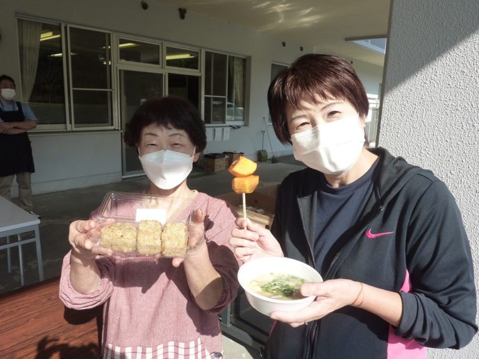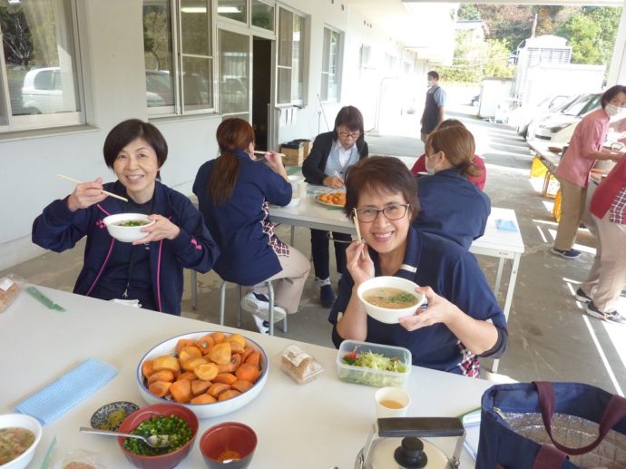 感染症対策を厳重に施したうえで、ようやく今年はこのような会をとり行うことができました。 少し寒い空気のなか、屋外で食べるあたたかい豚汁は格別でした!豚汁のほかに、かしわおにぎり、お菓子、柿もふるまわれましたよ。