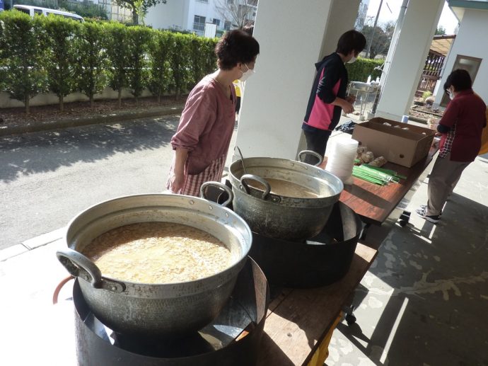 入所部、デイケア、居宅支援事業所、訪問介護事業所、秋月・甘木地域包括支援センターなど、ラ・パスにはたくさんの部署があり、多くの職員が働いています。そのため、つくる量がすごいんです!厨房職員を中心に、大きな鍋2つで豚汁を調理しました!