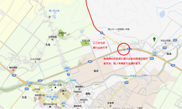 そこの看板にも掲げられている通り、弥永西から梨ノ木城までは通ることができます。