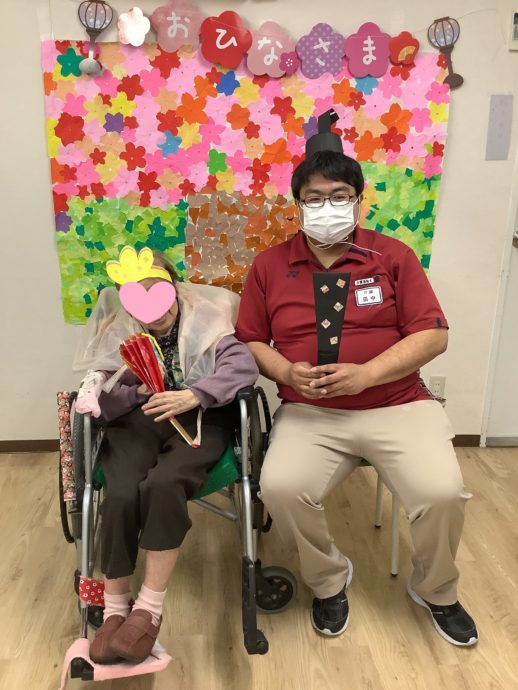 3月3日 甘木愛光園では、午後からひなまつりのレクレーションを行ないました。 BGMは”楽しいひなまつり” 職員の作った衣装を着てからの撮影会です。