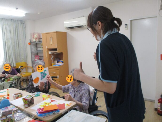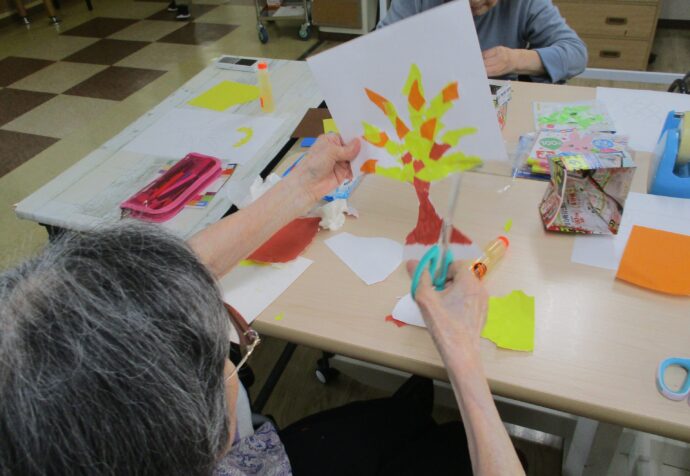 「柿の葉は緑にしますか?」ときくと「青や茶色がよかろうね」と話しながら色を選ばれ、素敵な作品ができました。