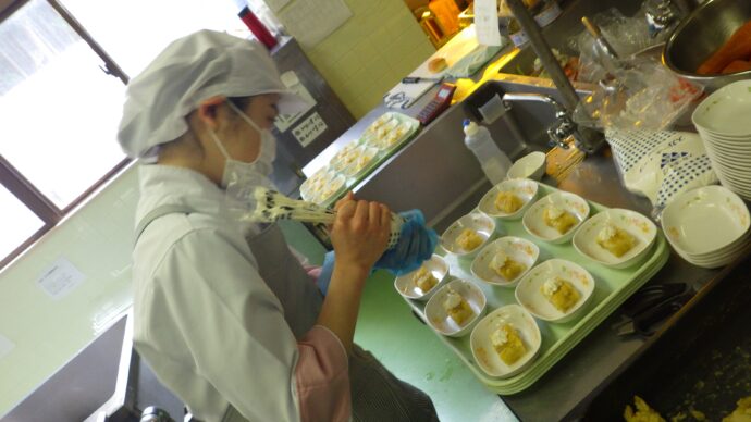 今回は実習生の考えたおやつを普通食からミキサー食まで、すべて作ってもらい実際に提供を行っています。