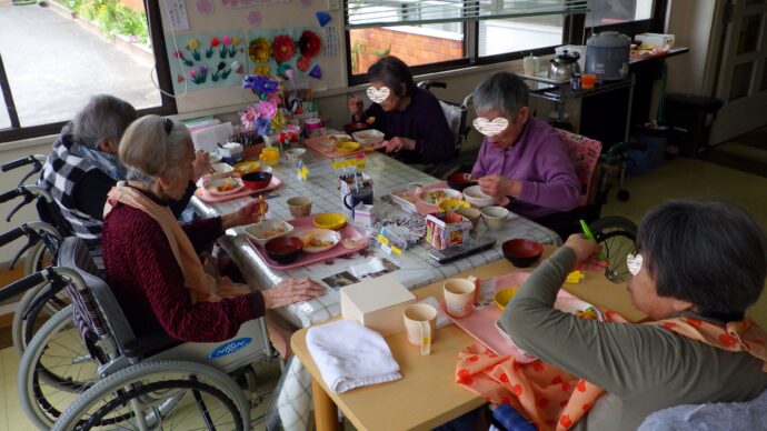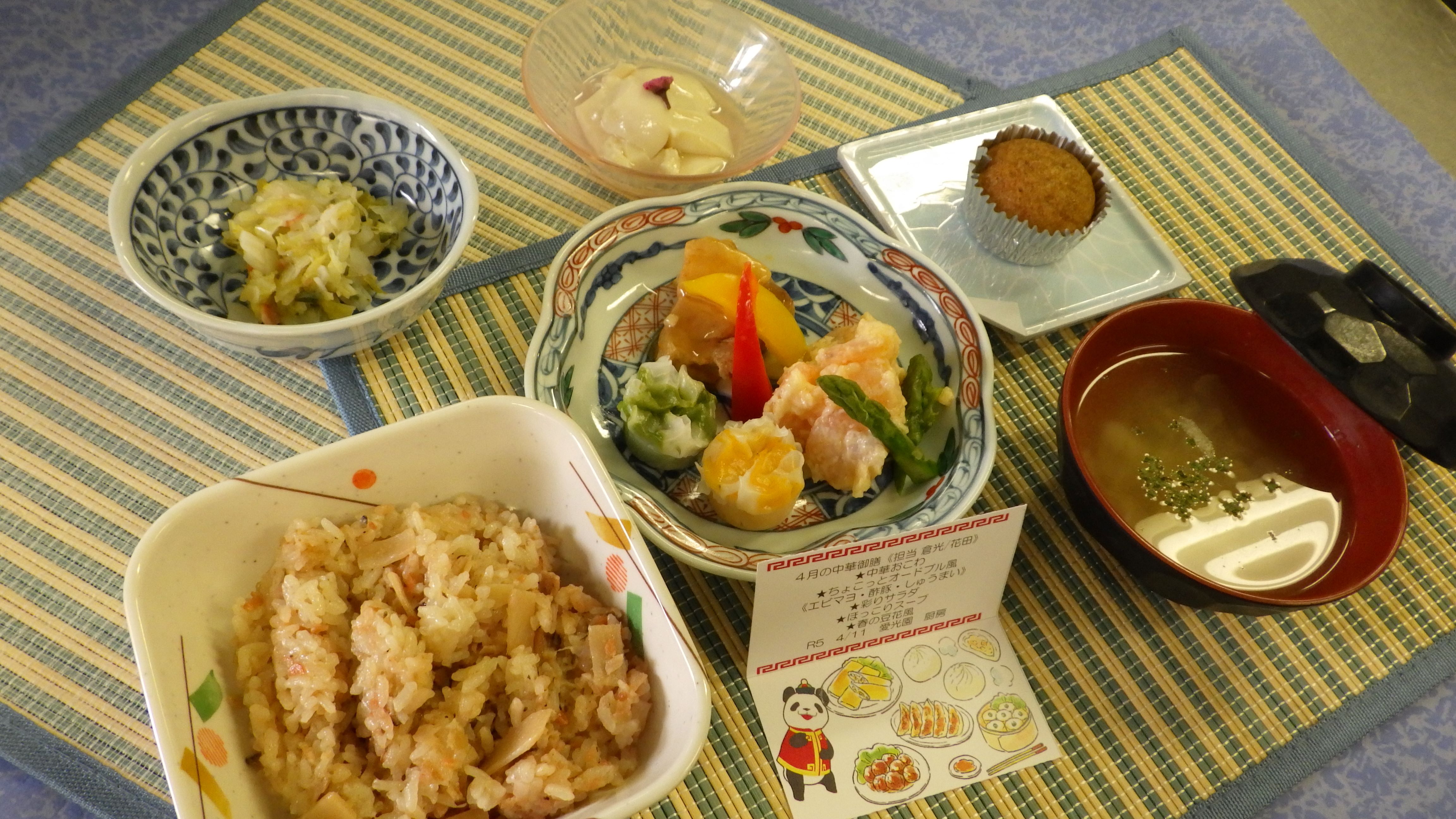 メニューは、「中華風おこわ・ちょこっとオードブル風(エビマヨとアスパラ添え・角煮酢豚・二色シュウマイ)春キャベツの彩りサラダ・新玉ねぎのほっこりスープ・さくら風味の豆花風」です。春の食材をふんだんに使いました。ご利用者様も食材に興味を持って楽しんで召し上がられていました。