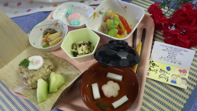 母の日にちなんでカーネーションを連想させるピンク色などの明るい色合いを出し、おむすびを竹皮に包むなど工夫を凝らした料理を作りました。