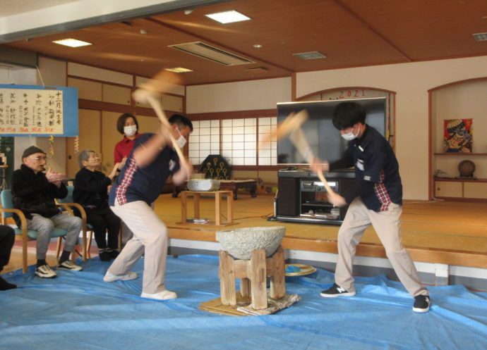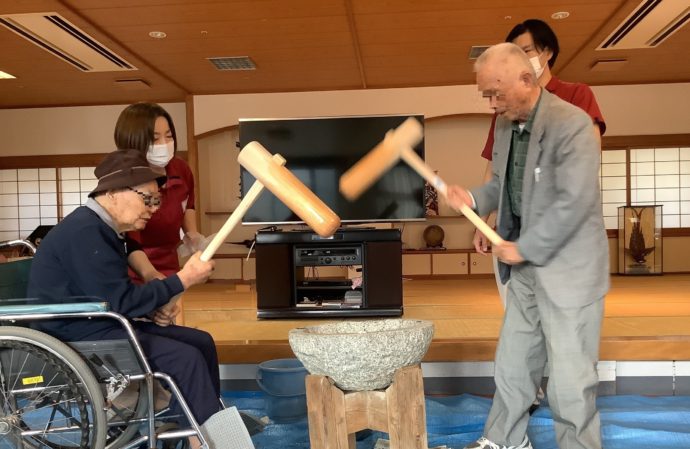 入所者様もショートステイ利用者様も職員も、みんなでお餅をつきました。