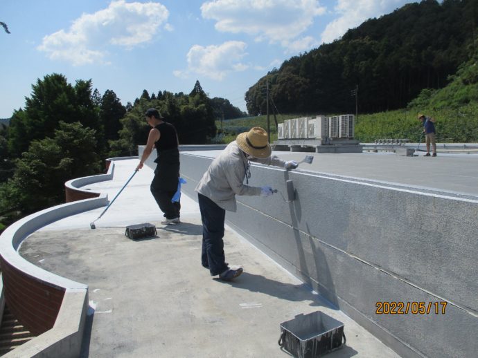 甘木愛光園誕生して40年、職員が屋上のペンキを塗り続けています。