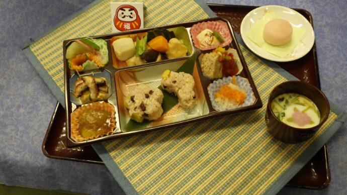 色々な料理を少しずつ入れたお弁当箱のお膳で提供しました。皆様、楽しく召し上がられており、良かったです☺