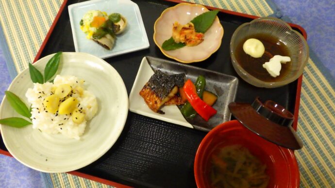 今月のお膳は、”食欲の秋”の言葉の通り秋の味覚のくり🌰、いも🍠、きのこ🍄をメインにしたメニューを考案しました。