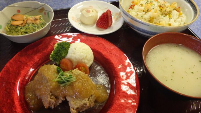 今年のクリスマス膳は、ミートローフやピラフ、いちごのムースなど料理や盛り付けでクリスマスを感じてもらえるお膳を提供しました。