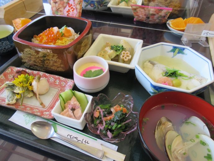 ちらし寿司、鯛のかぶら蒸し、たらの芽と大根おろしの天ぷら、スモークサーモンと菜花の和え物、炊き合せ、茶碗蒸し、はまぐりの吸い物